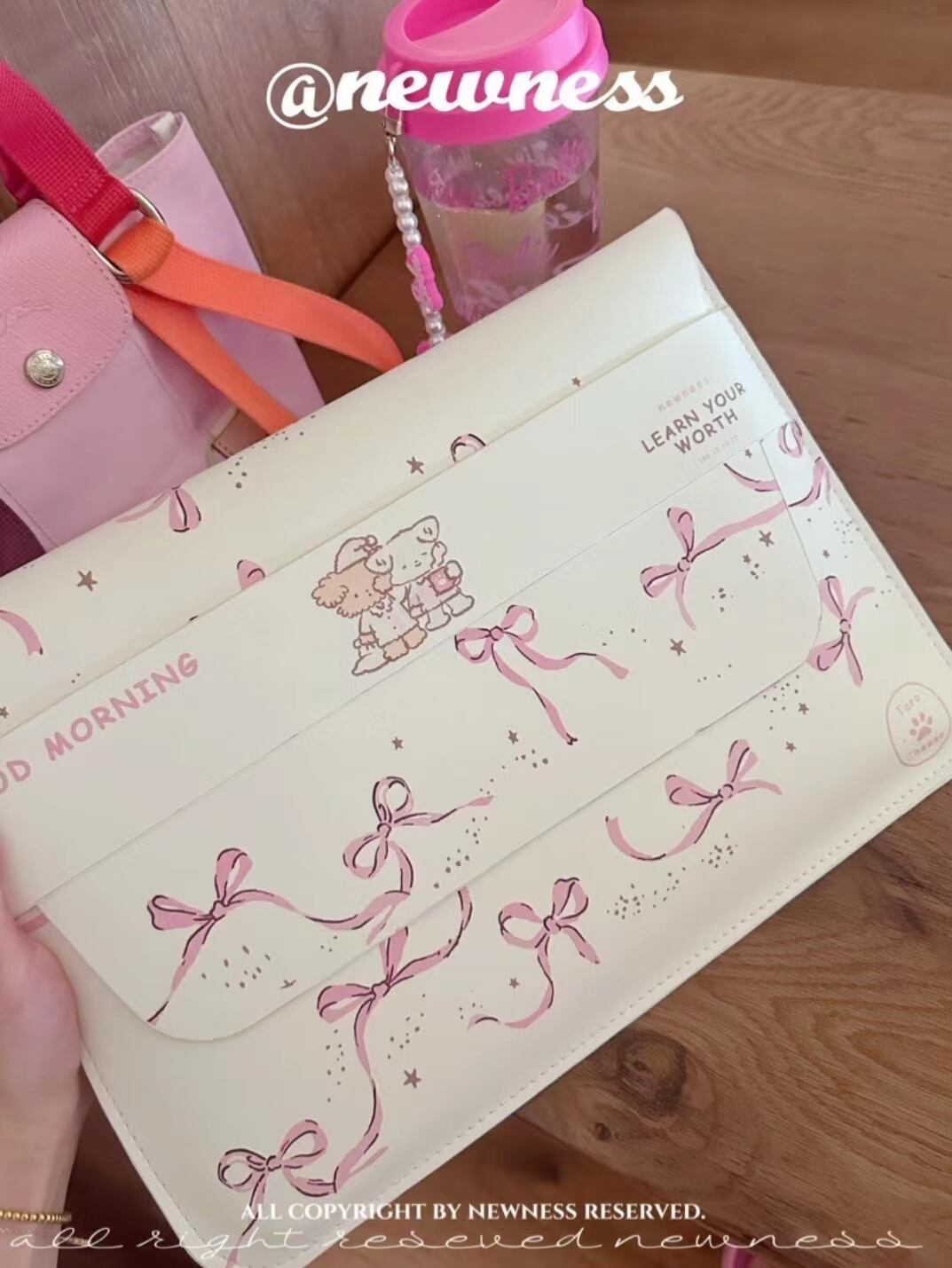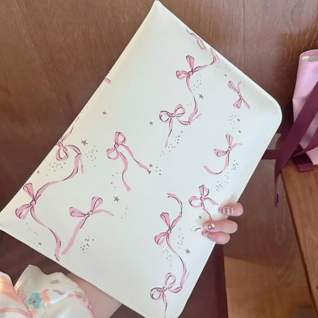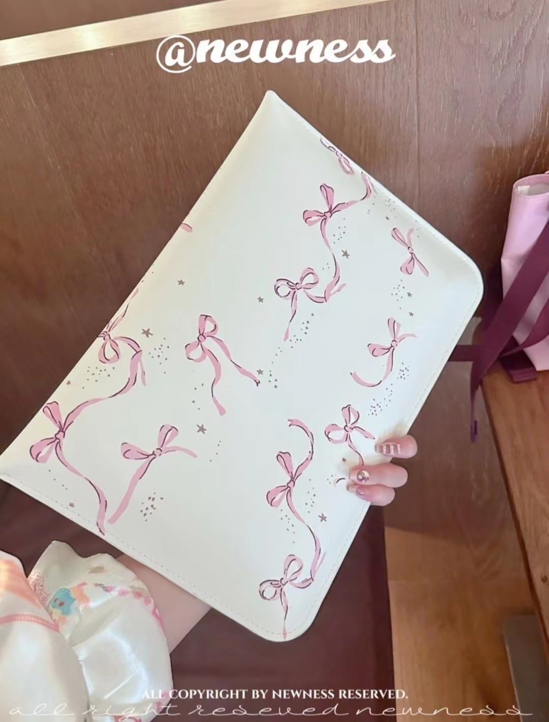 【防水&ノンマグネット】人気のリボン柄タブレットケース◎軽量ノートPC収納 ホワイト×ピンク マルチバッグ MacBook iPad 韓国 おしゃれ 蝶々結び パソコンケース ND-16290