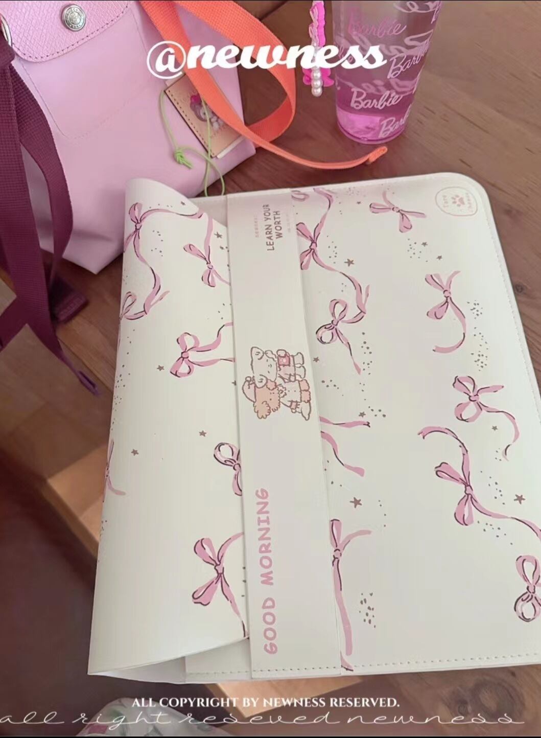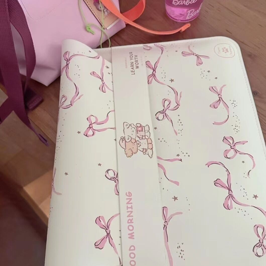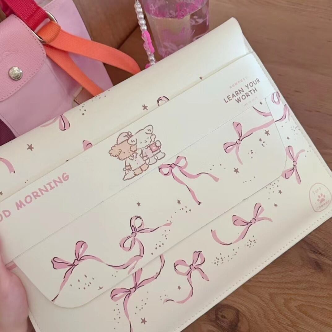 【防水&ノンマグネット】人気のリボン柄タブレットケース◎軽量ノートPC収納 ホワイト×ピンク マルチバッグ MacBook iPad 韓国 おしゃれ 蝶々結び パソコンケース ND-16290