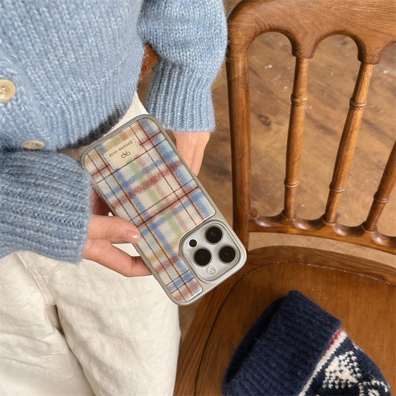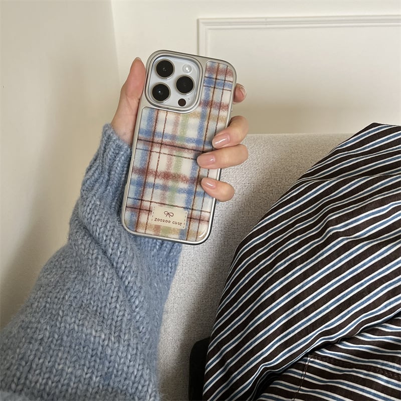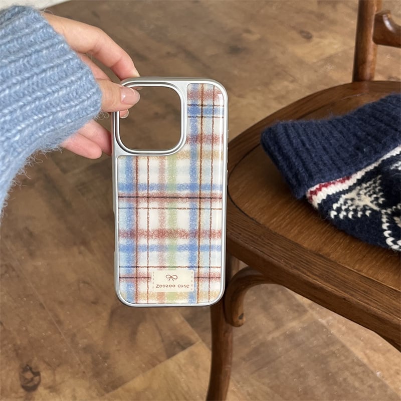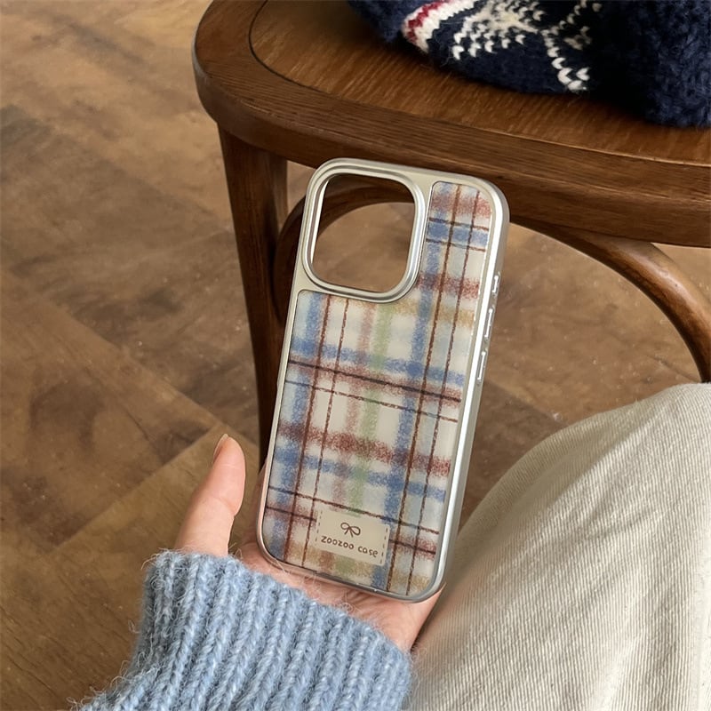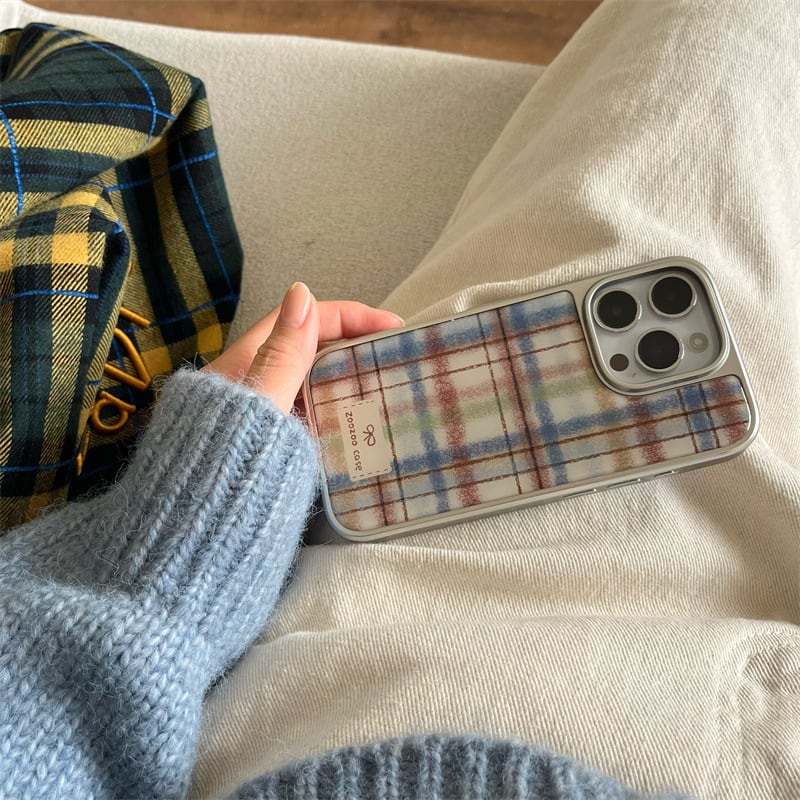 【iPhone17-11まで対応】秋冬のおしゃれケースはこれだ!◎韓国風レトロなチェック柄 マットシルバーケース チェック柄 艶 スマホケース ND-16445