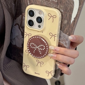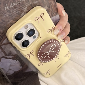 クリームイエロー×ブラウンの上品カラー。韓国っぽデザインで、シンプルだけどとびきり可愛いリボン柄のiPhoneケースです。