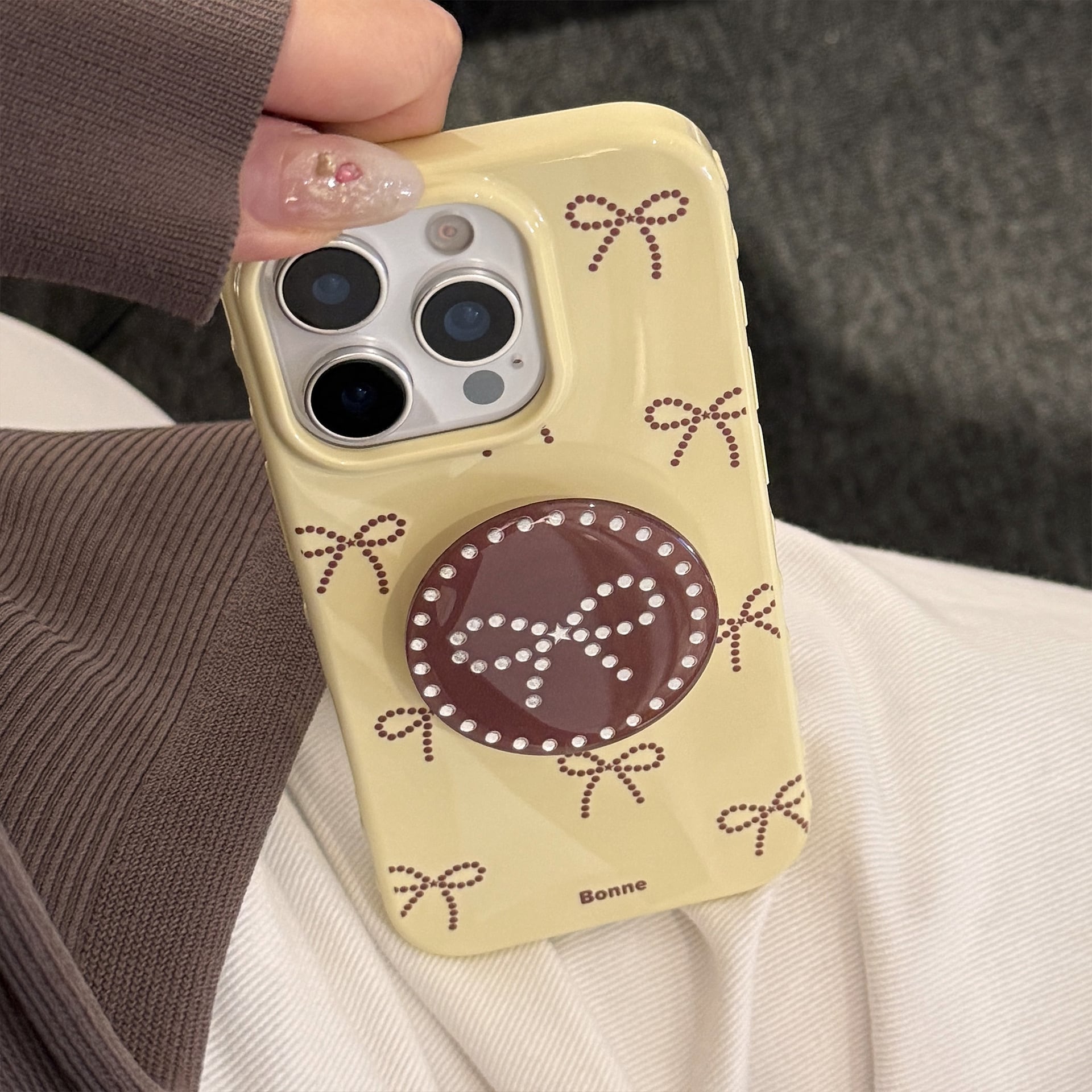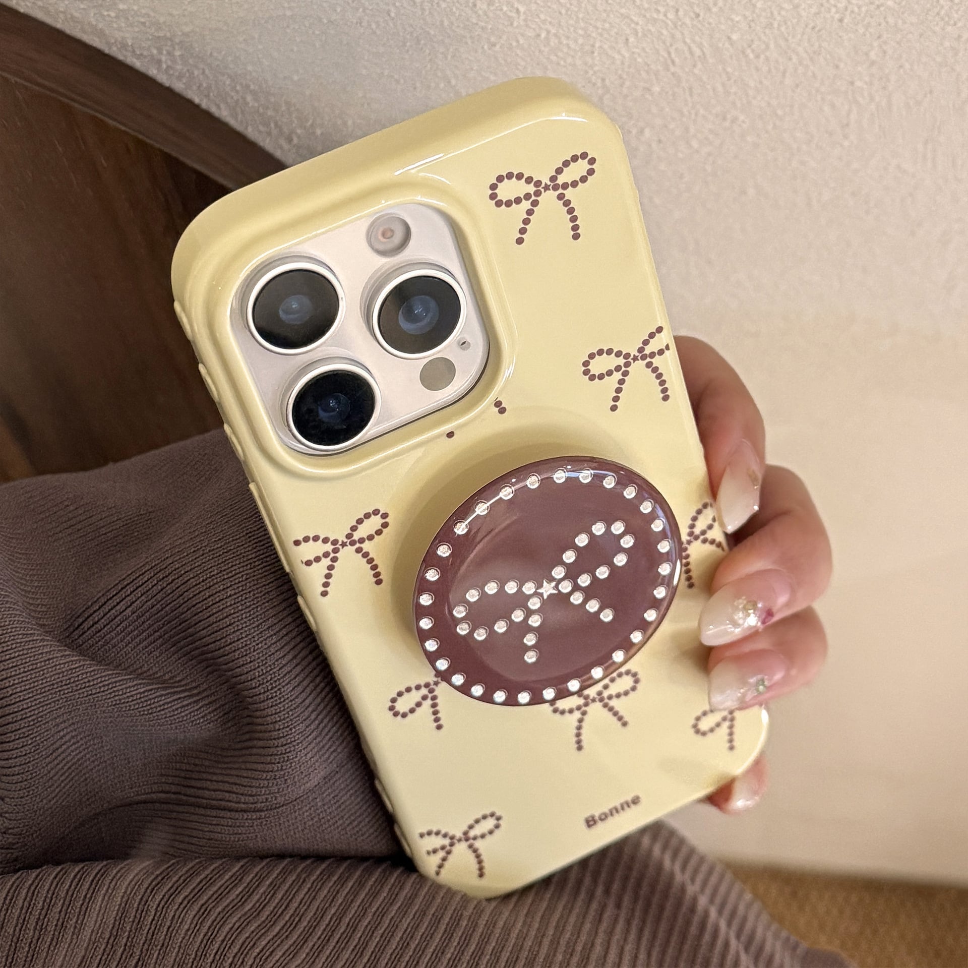 【iPhone17~12まで対応】大人可愛いリボンケースならこれ◎クリームイエロー ブラウン 韓国ケース スマホグリップ かわいい 蝶々結び スマホケース ND-16508
