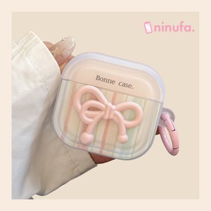 やさしいストライプ柄にぷっくり立体リボンが映える、韓国デザインのAirPodsケース。