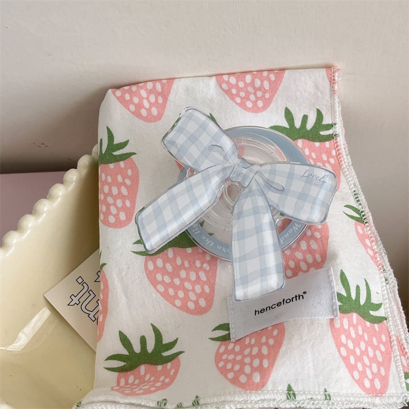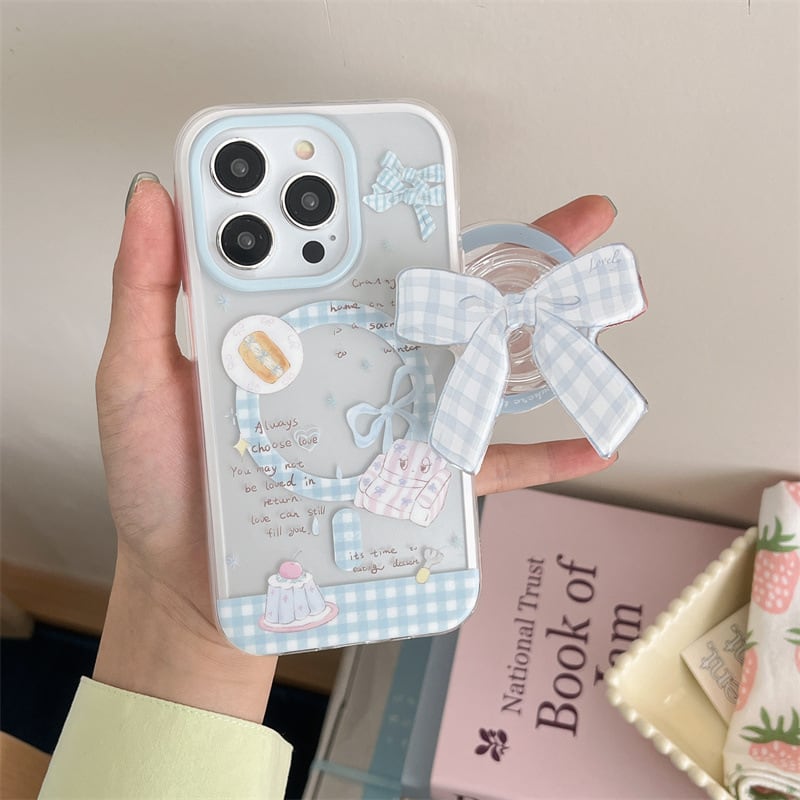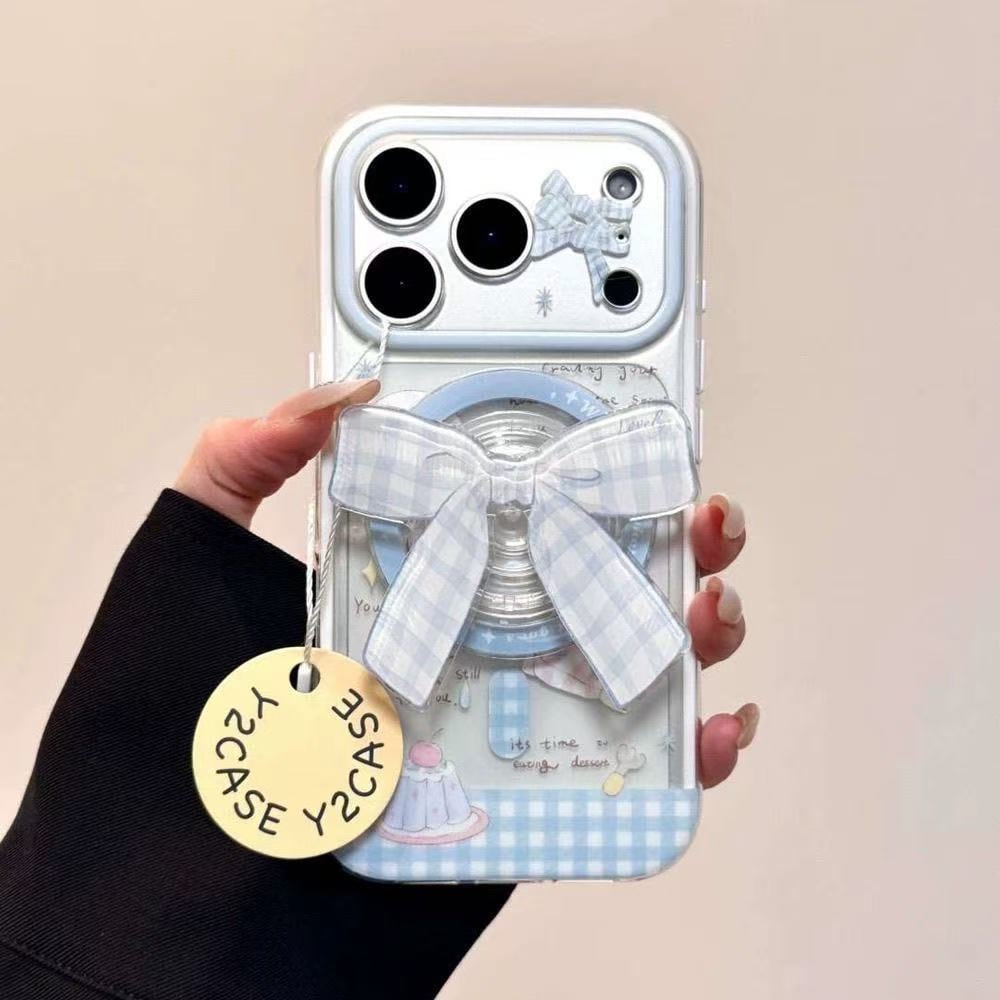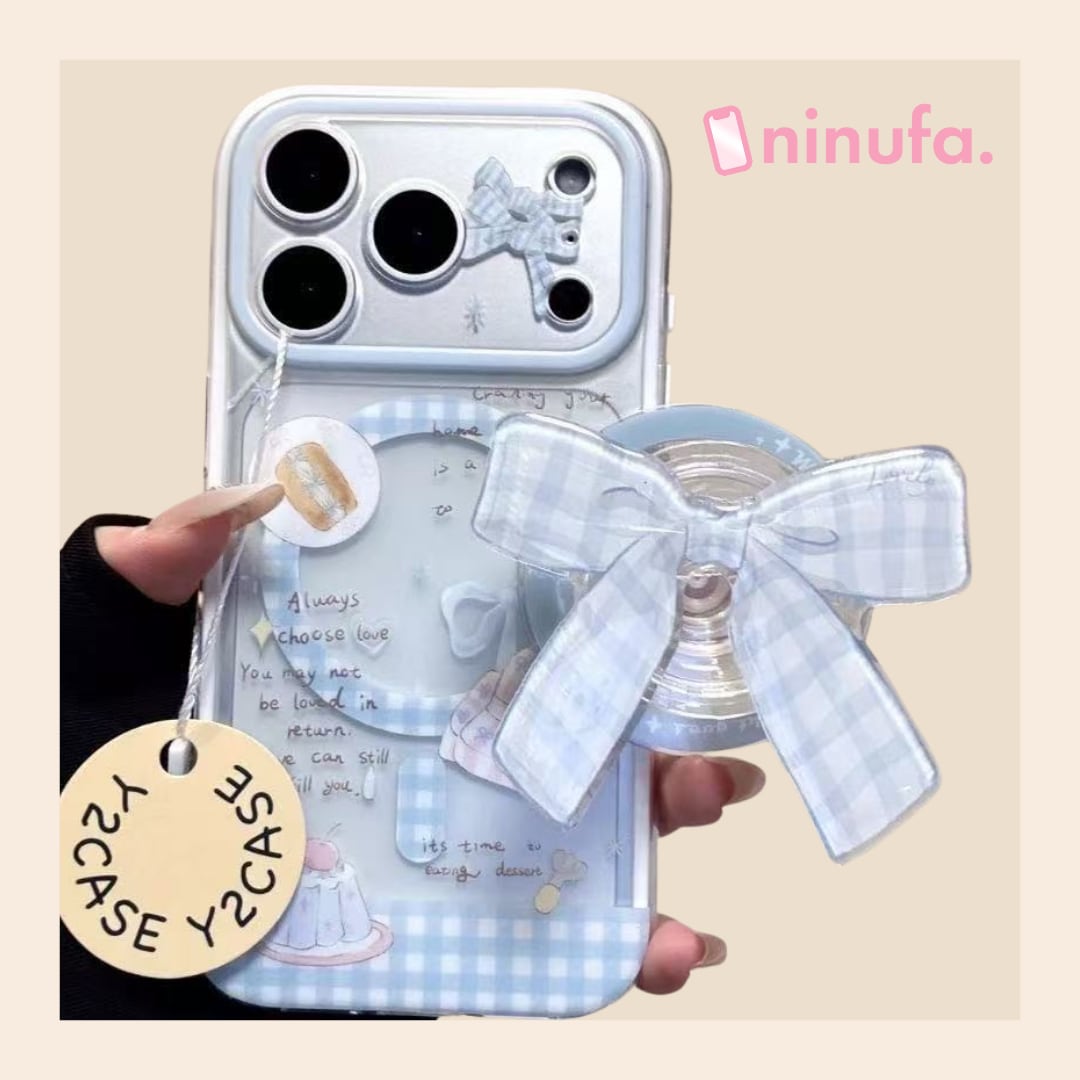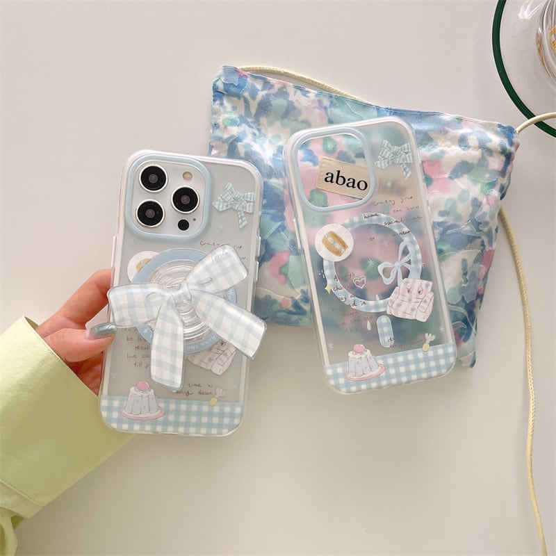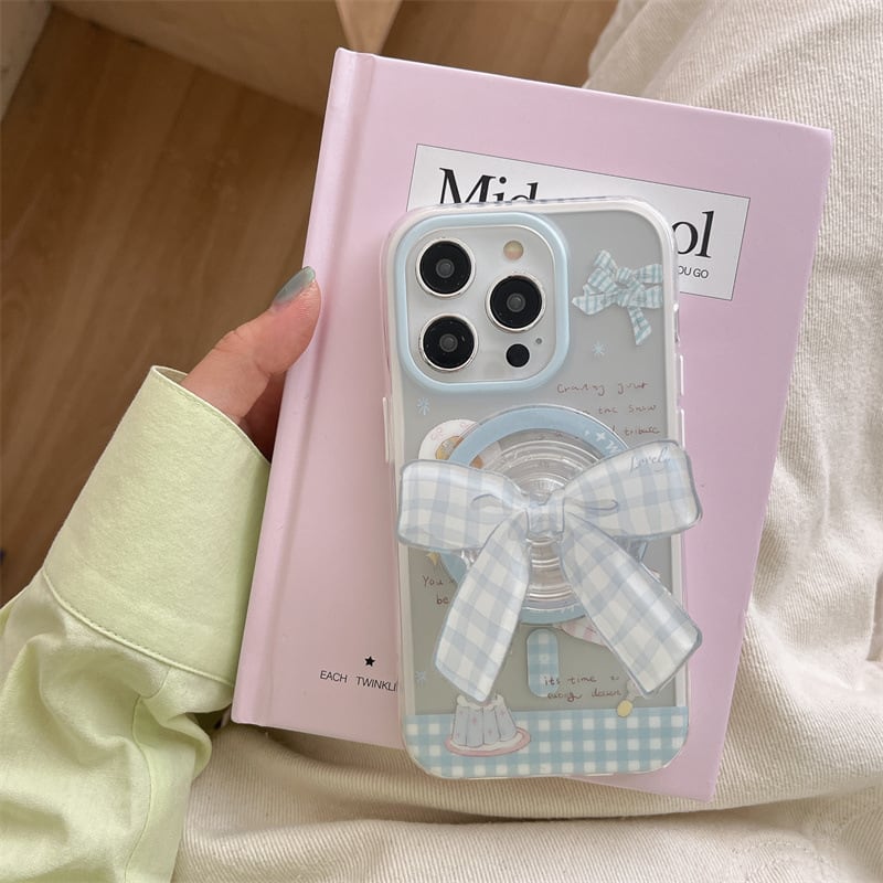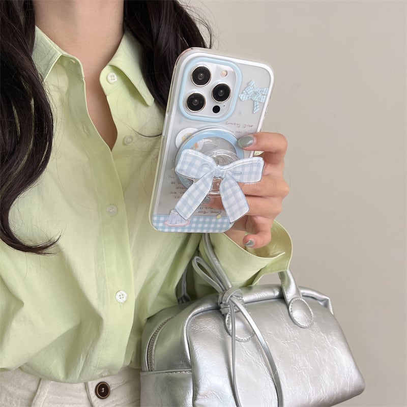 【MagSafe対応】ブルーチェック×リボン◎たまらん可愛さ 韓国ケース ギンガムチェック 透明 マグネットグリップ ブルークリア 蝶々結び スマホケース【iPhone17-SEまで対応 】ND-16574