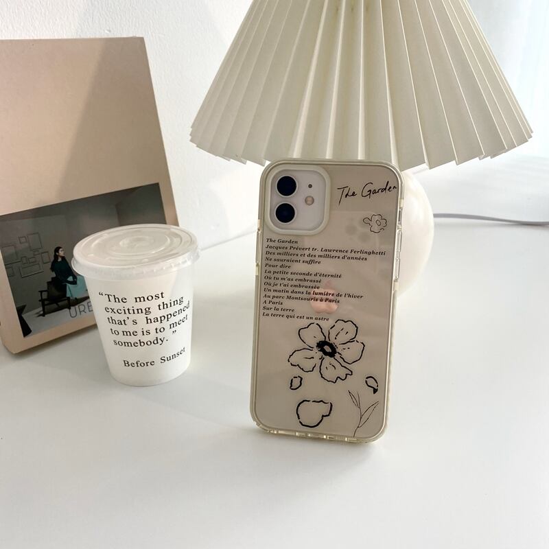フラワーアートと文字のプリントがお洒落なスマホケースです。