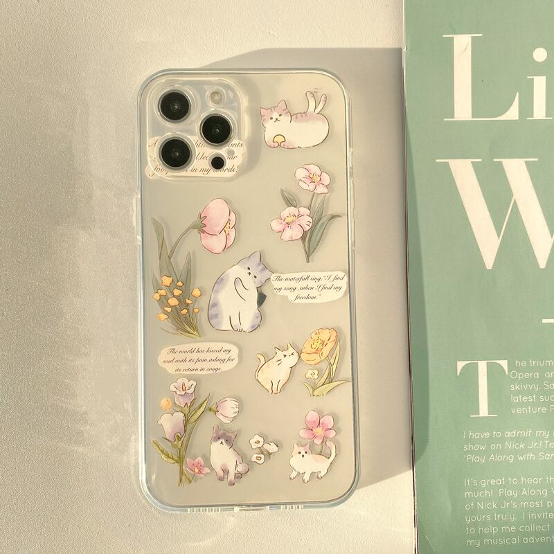 クリアベースにお花と猫さんがデザインされたスマホケース。