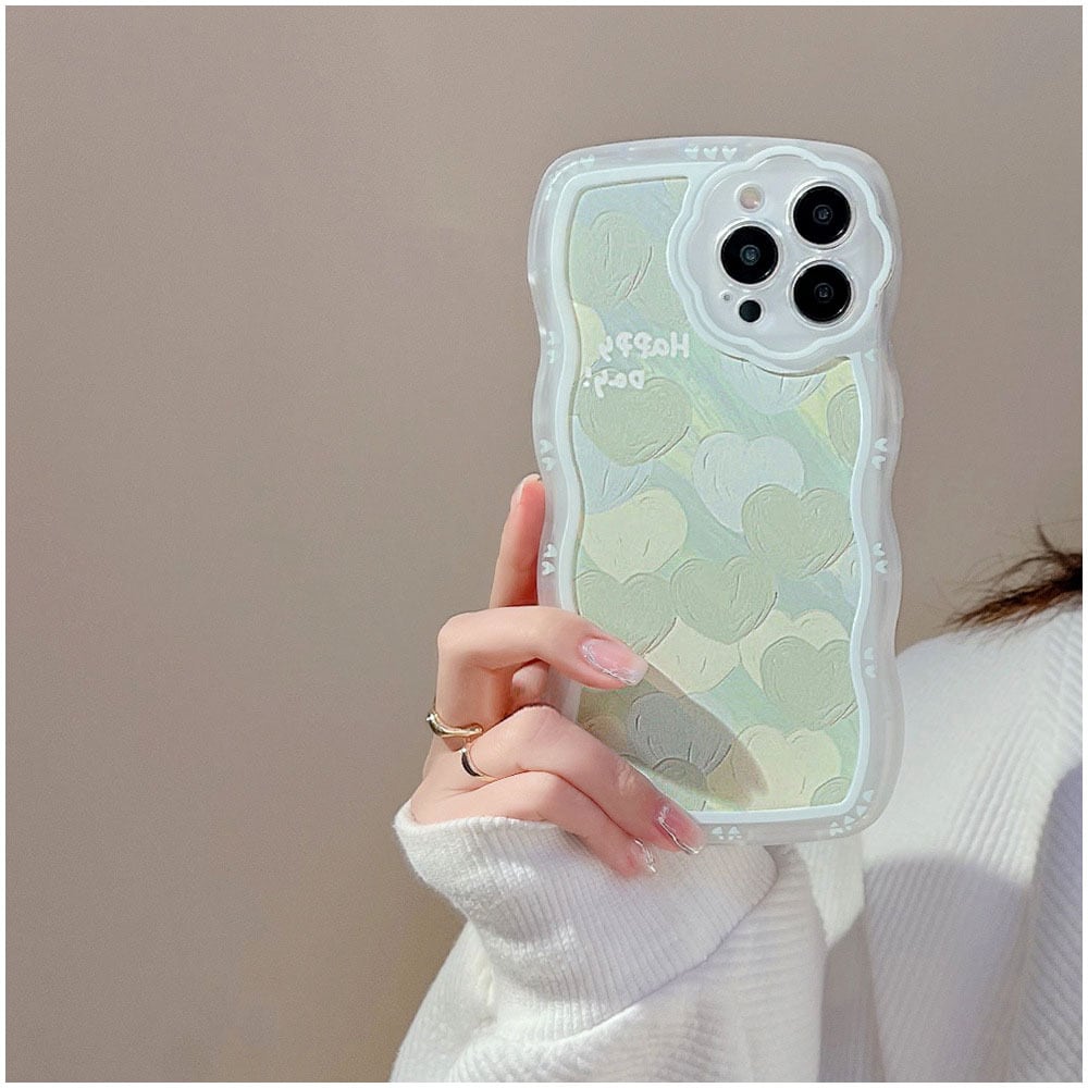 優しいペールグリーンが落ち着く◎ウェーブフレーム ハート柄 ペイント風 カメラ保護 iPhone15 落下防止 韓国っぽ 半透明 クリアケース スマホケース ND-14682