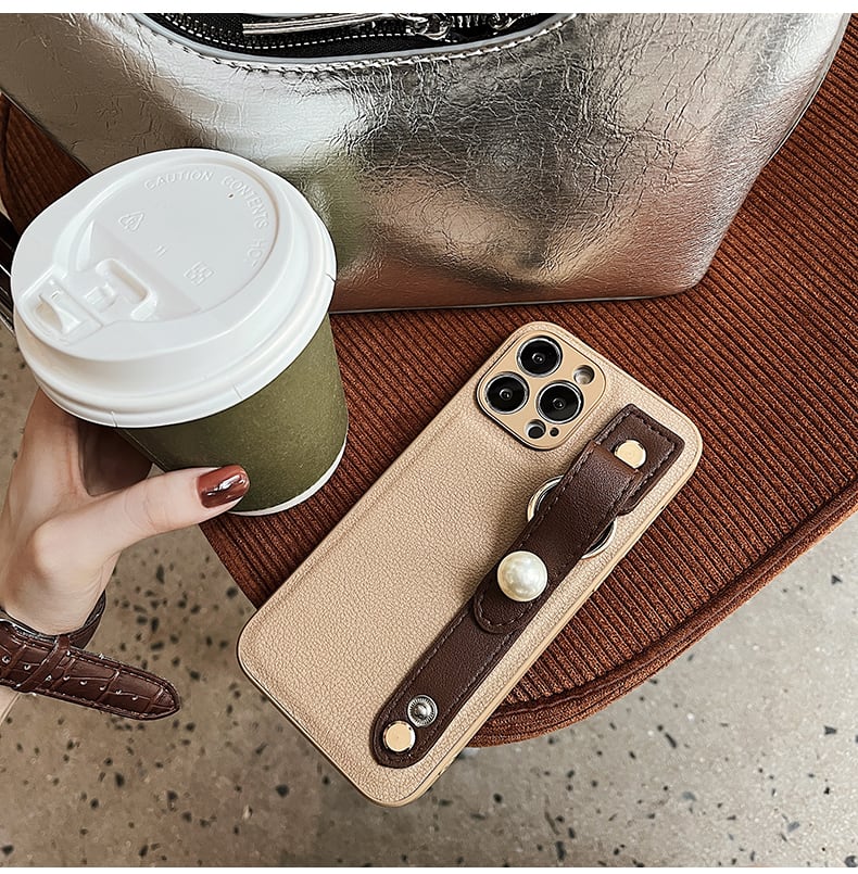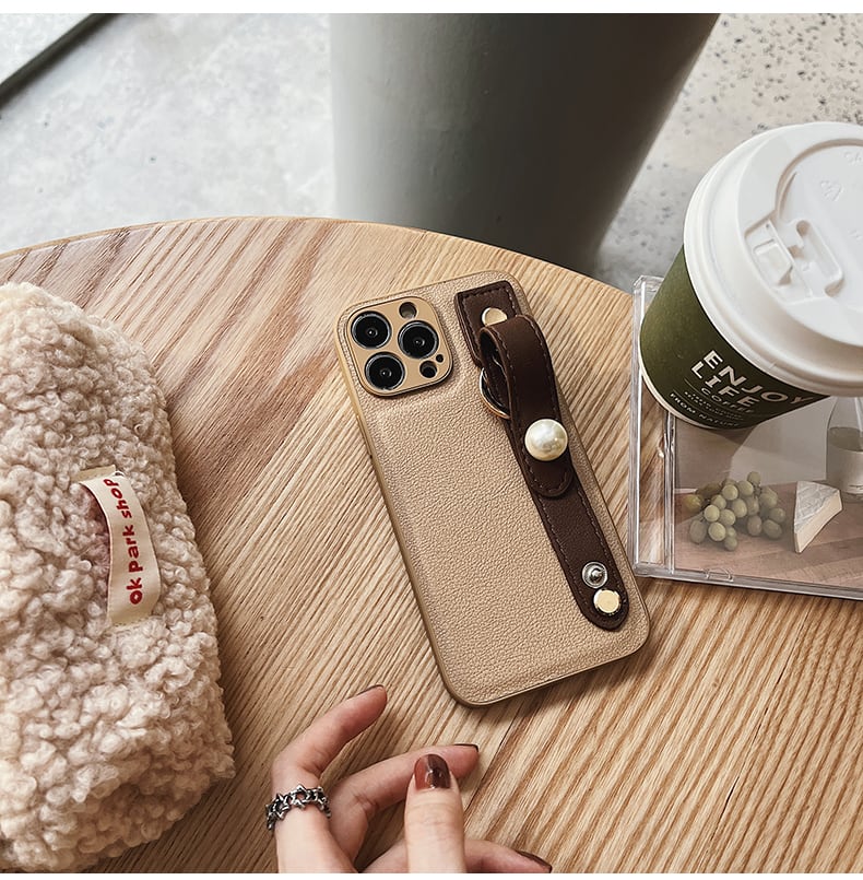【再販】ラテカラーで大人っぽ◎落下防止ベルト iphone14 対応 フェイクレザー パールチャーム付き 耐衝撃 カメラレンズ保護 レザー調 スマホケース ND-14742