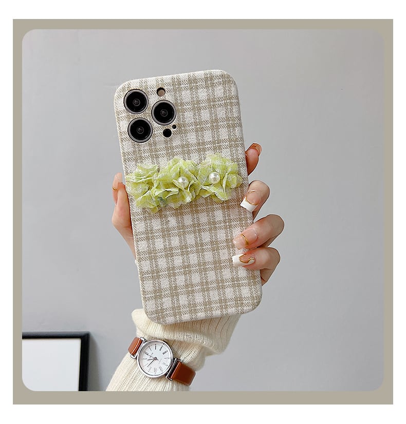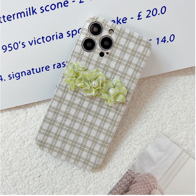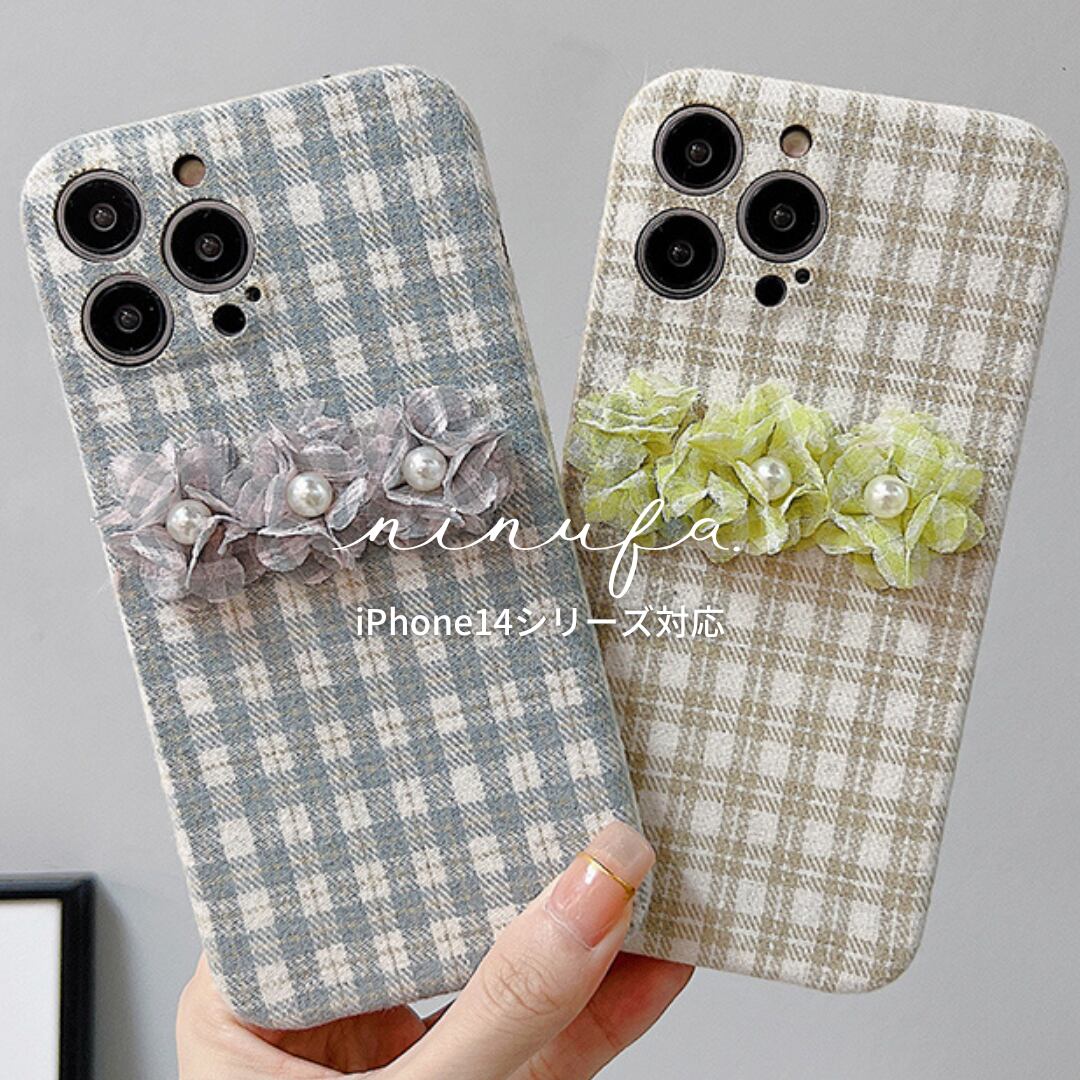 淡色チェック柄◎フラワーデコ 新型iPhone14 ケース カメラレンズ オール保護カバー かわいい スマホケース ND-14793