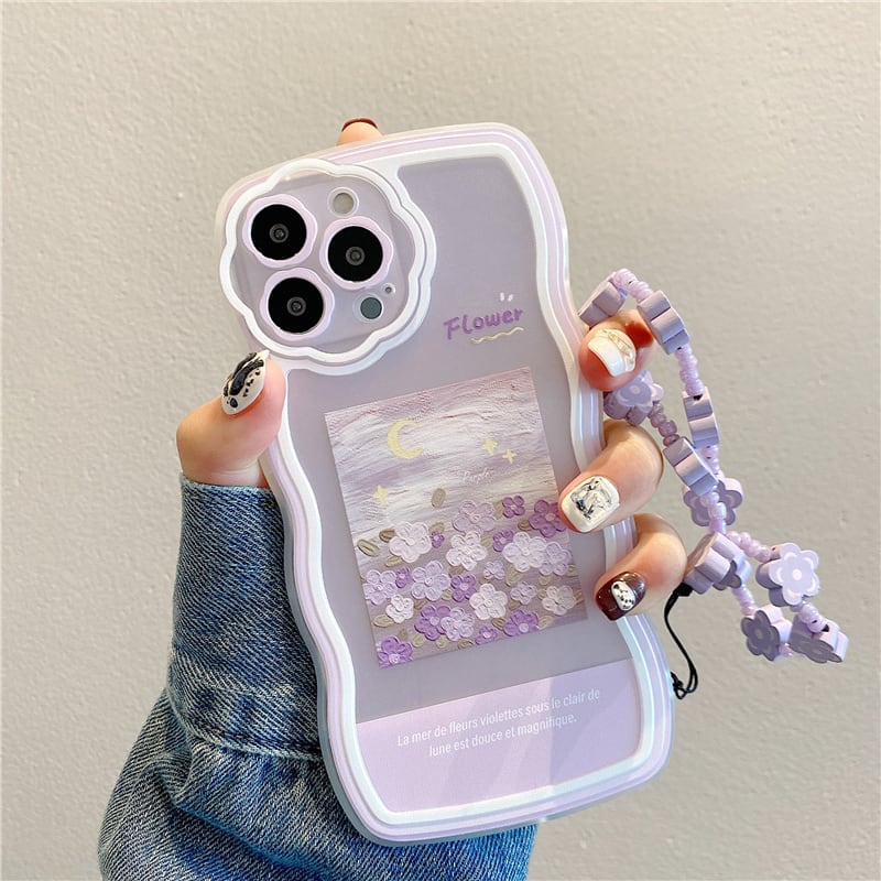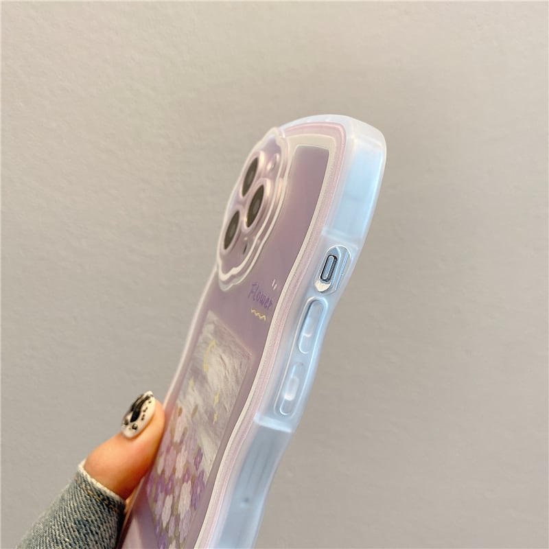 かわいいペールパープル◎大人気 ウェーブフレーム 花 カメラ保護 半透明 クリアケース 新型 iPhone15 対応 落下防止ストラップ フラワー柄 スマホケース ND-14869 【再販】