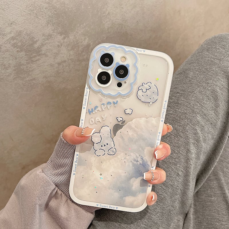 【再販】ふわもこ◎可愛いうさぎ×いちご 新型 iPhone14 シリーズ対応 クリアケース 雲 くま カメラレンズ保護 韓国っぽ ゆめかわ スマホケース ND-14885