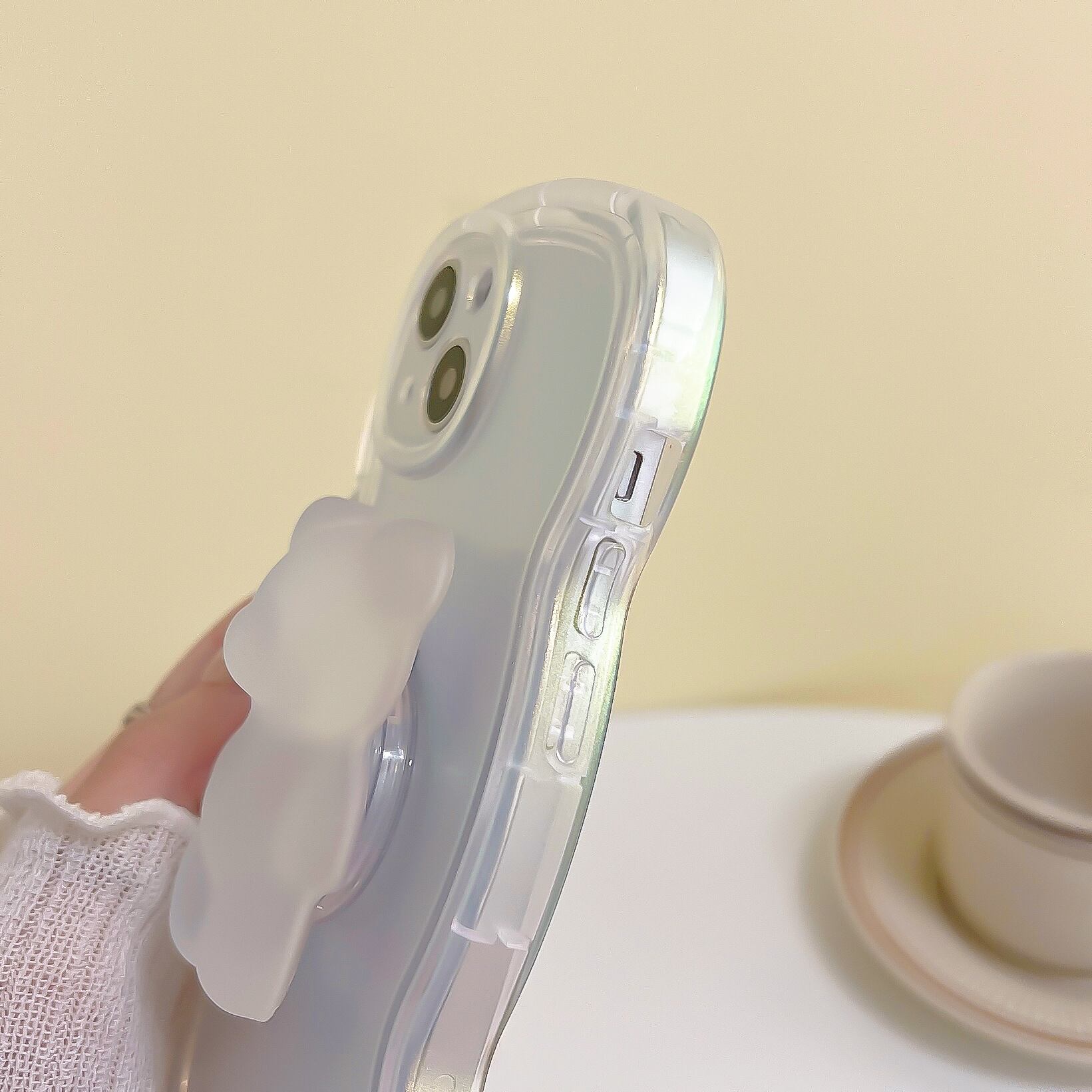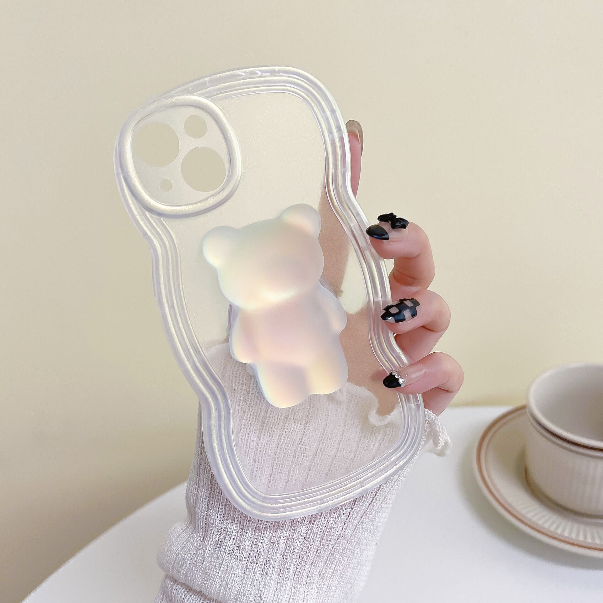 【新型★iPhone15対応 】クマさん可愛すぎ◎ハンドグリップ 付き ウェーブフレーム オーロラ クリアケース くま スマホスタンド カメラ保護 ベア スマホケース ND-14977