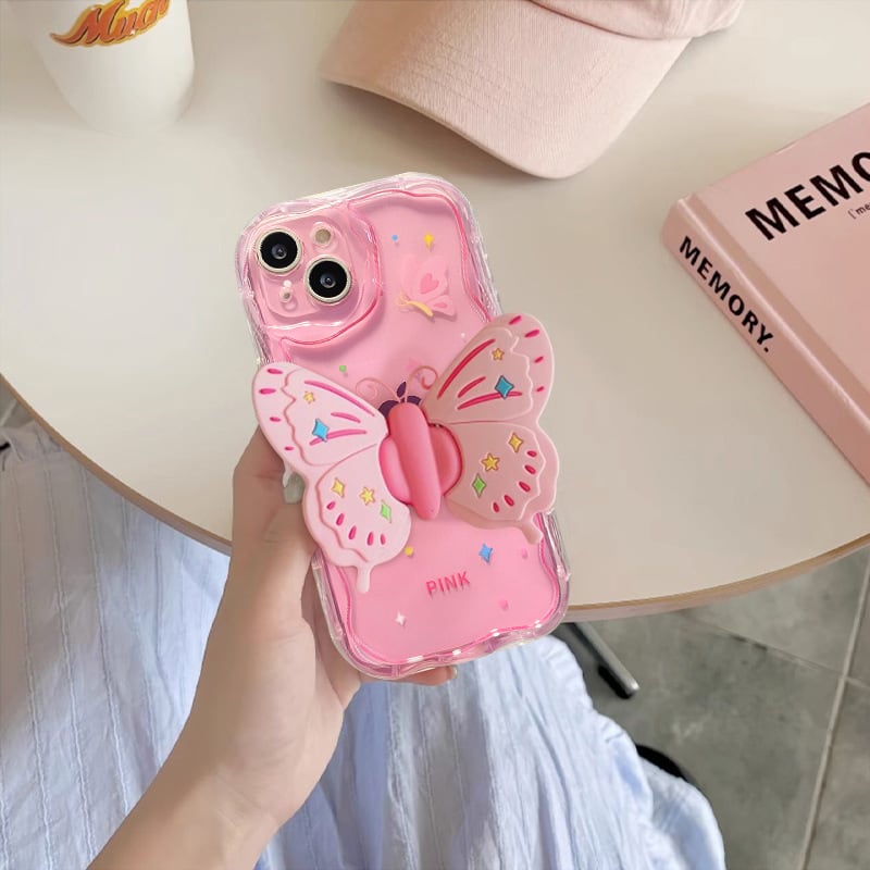 【iPhone全機種対応】今にも飛び立ちそう◎蝶々 ピンク 透明ケース スマホグリップ ウェーブフレーム カメラ保護フレーム バタフライ クリアケース 韓国っぽ PINK スマホケース ND-15285
