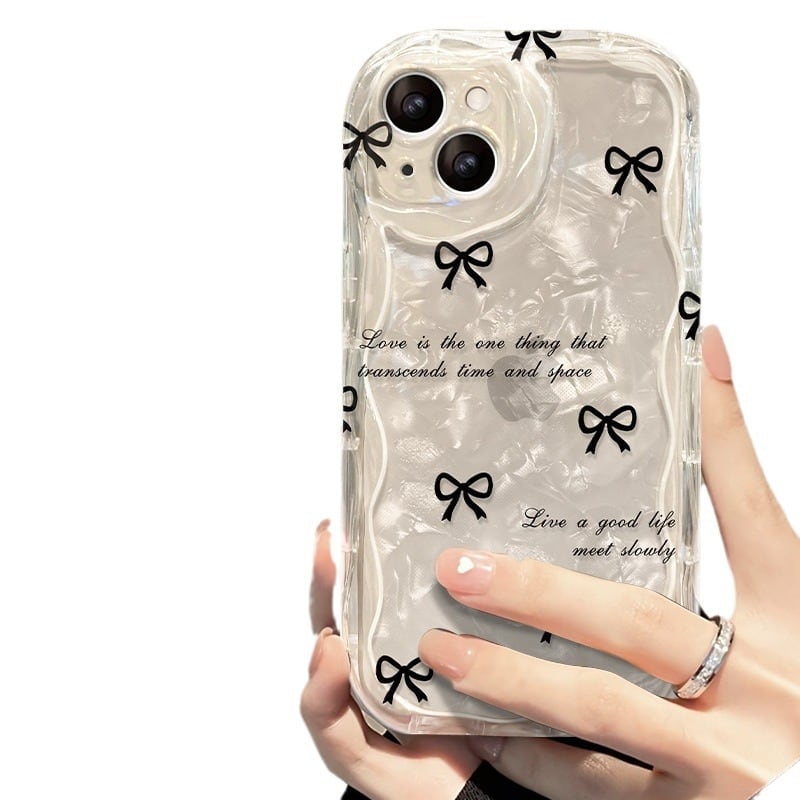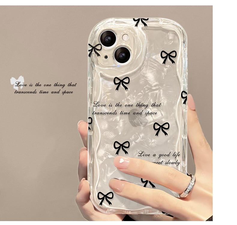 【iPhone全機種対応】上品で可愛い◎ブラックリボン ホワイトシェル 背景フィルム ウェーブフレーム 美しい アイボリー クリアケース 蝶々結び 透明 韓国っぽ スマホケース ND-15291