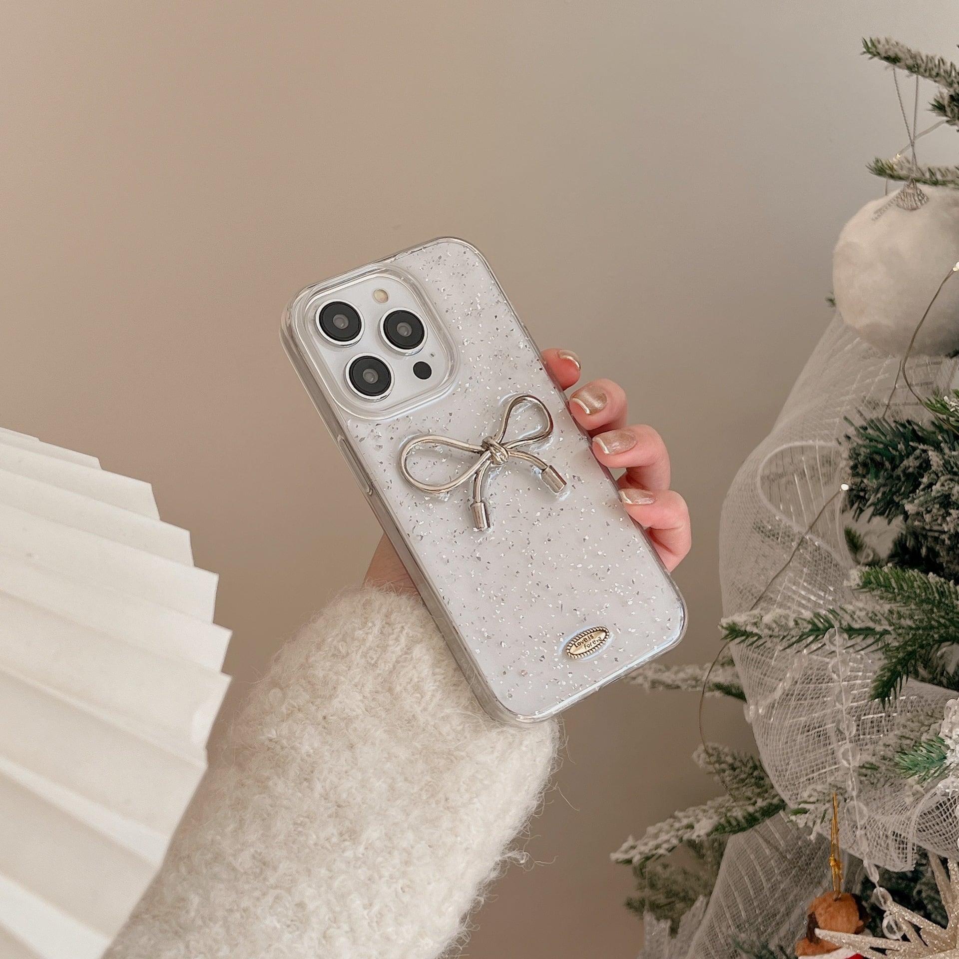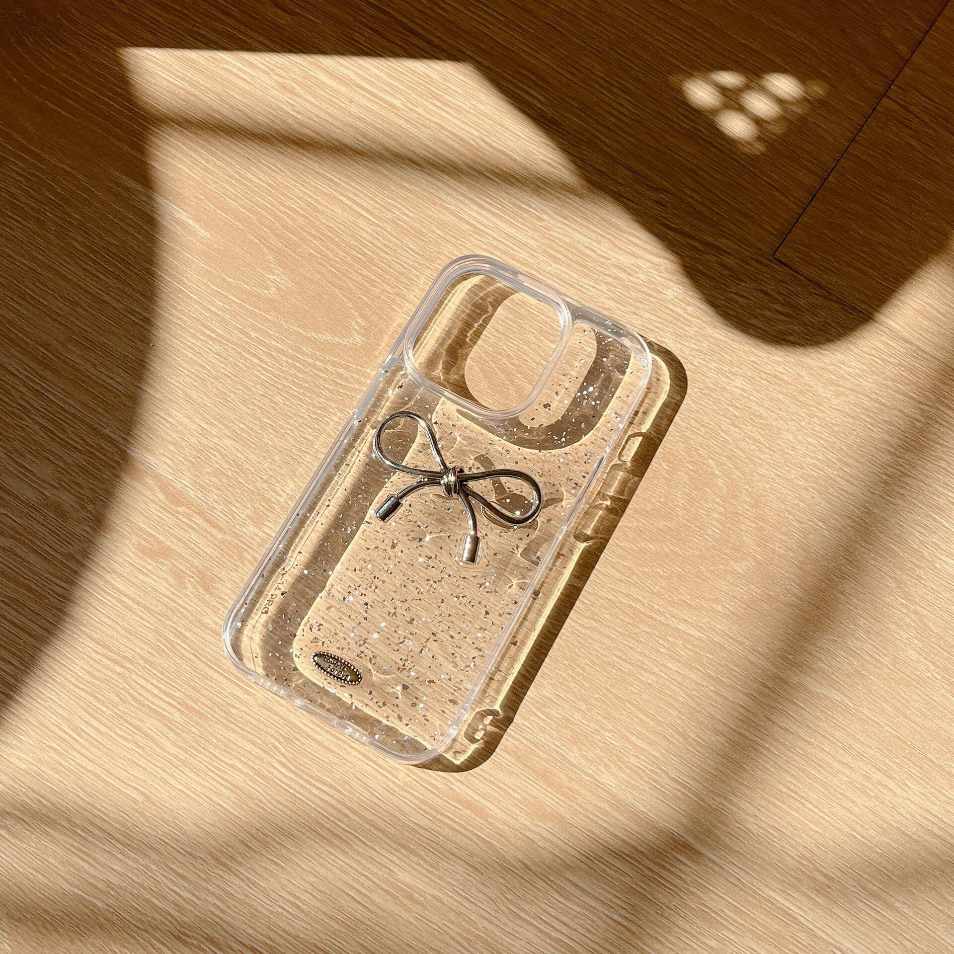 シルバーの蝶々結びが印象的な立体デコケースです。
