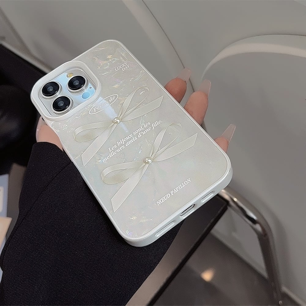 【iPhone15シリーズ対応】人気のシェル×リボン◎ホワイトシェル カメラ保護フレーム オシャレ 貝殻 ホワイトリボン スマホケース ND-15377
