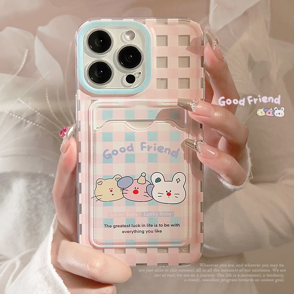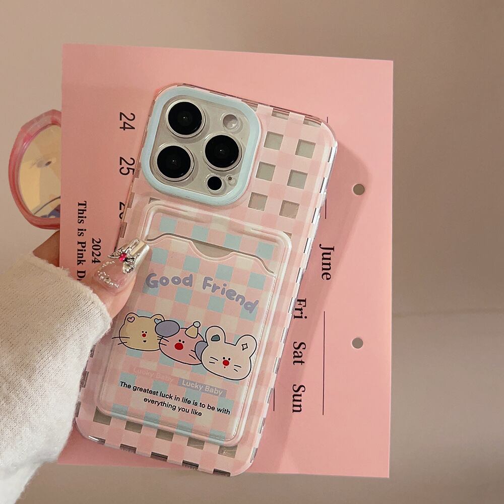 【iPhone15シリーズ対応】かわいいチェック柄◎韓国ケース ブルー×ピンク カードケース付き キャラクター 可愛い 透明 スマホケース ND-15385