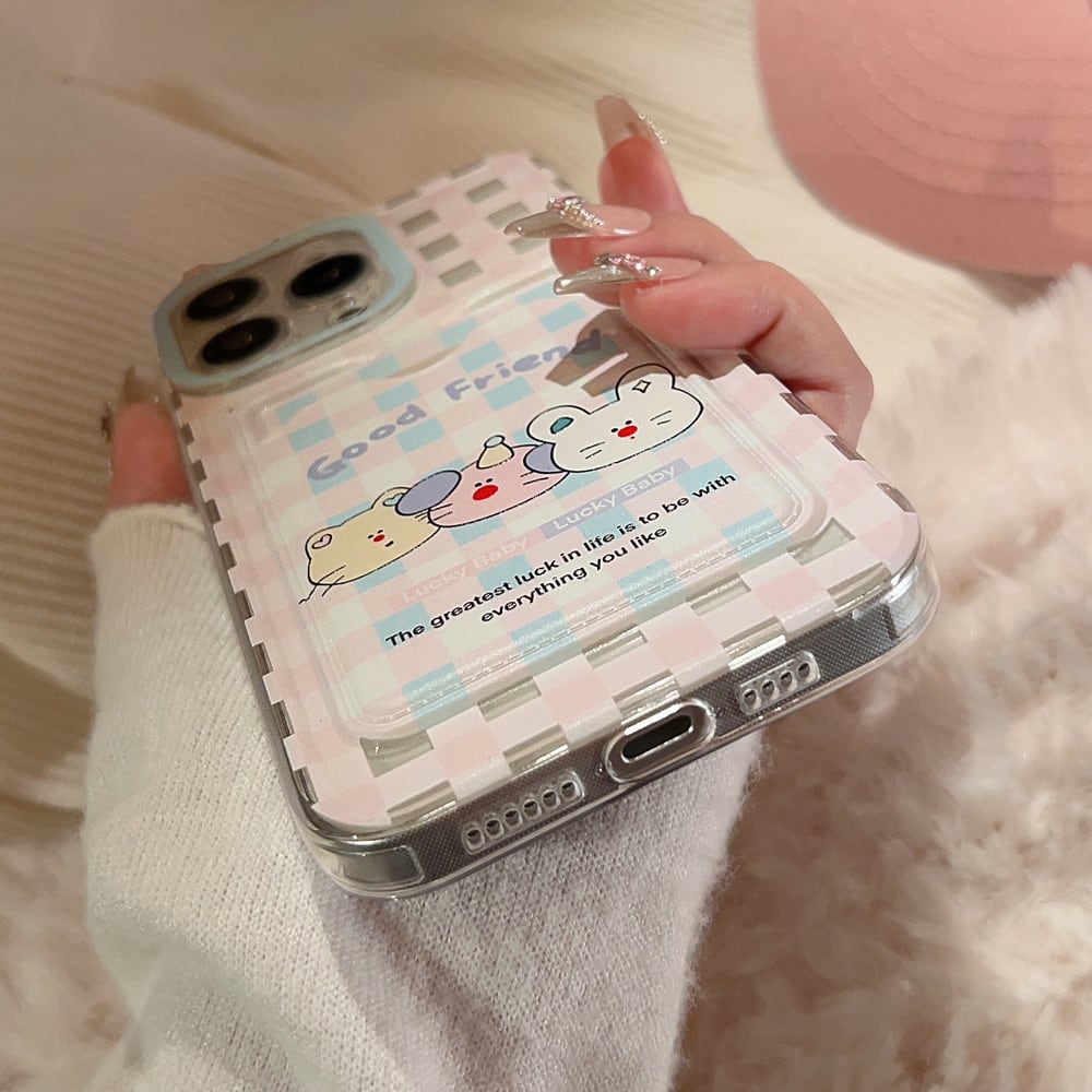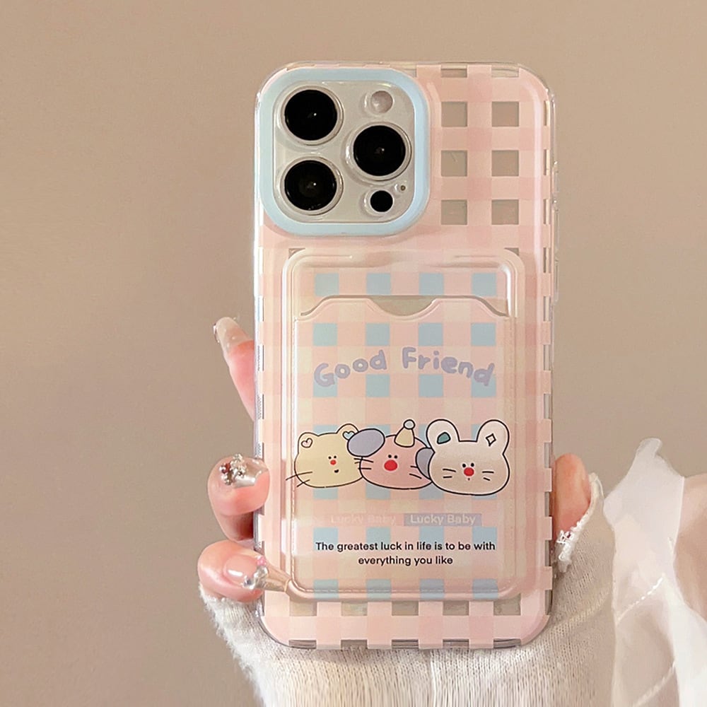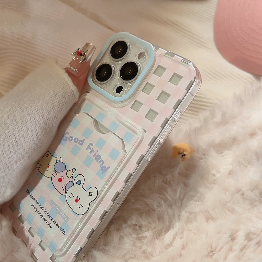 イラストが韓国っぽかわいいチェック柄ケースです。