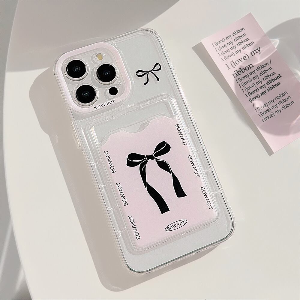 推しをそっと忍ばせよっ◎可愛いブラックリボン カードポケットつきクリアケース ピンク×黒 ボウタイ 蝶々結び 透明 スマホケース ND-15512