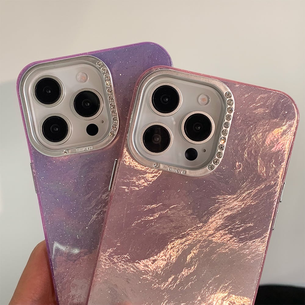 箔紙みたいで美しい◎妖艶オーロラ 高級感 iPhone16シリーズ ケース カメラ保護 メタルフレーム ラインストーン スマホケース ND-15548