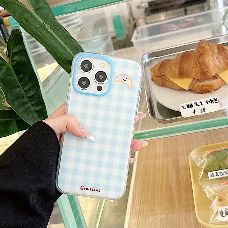 おちゃめなクロワッサン◎チェック柄 かわいい 韓国ケース iPhone15 カメラ保護フレーム トースト ピンク 水色z 格子柄 スマホケース ND-15852