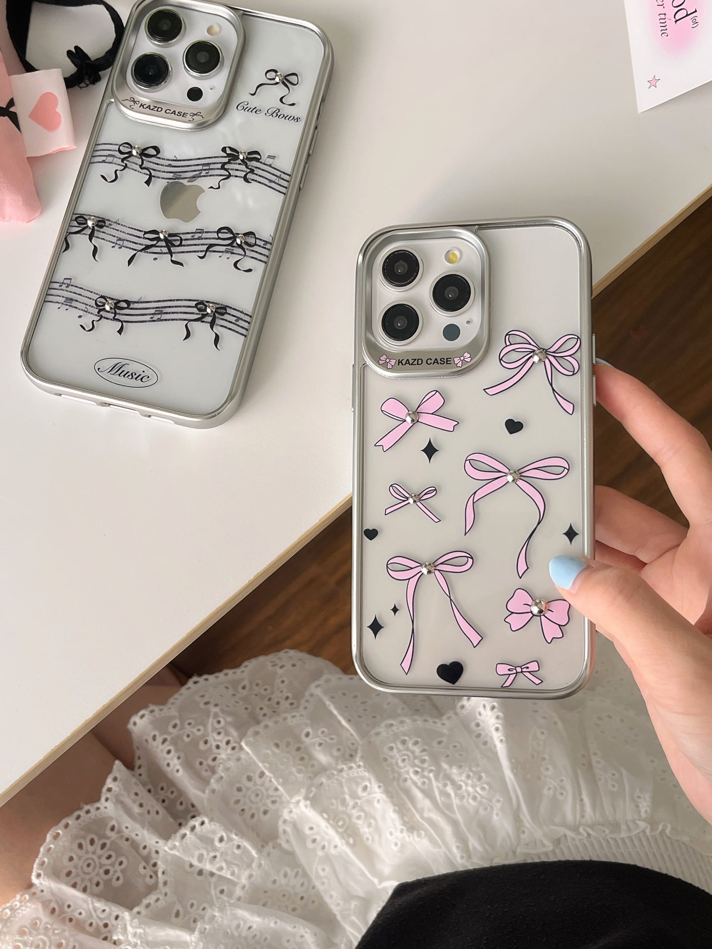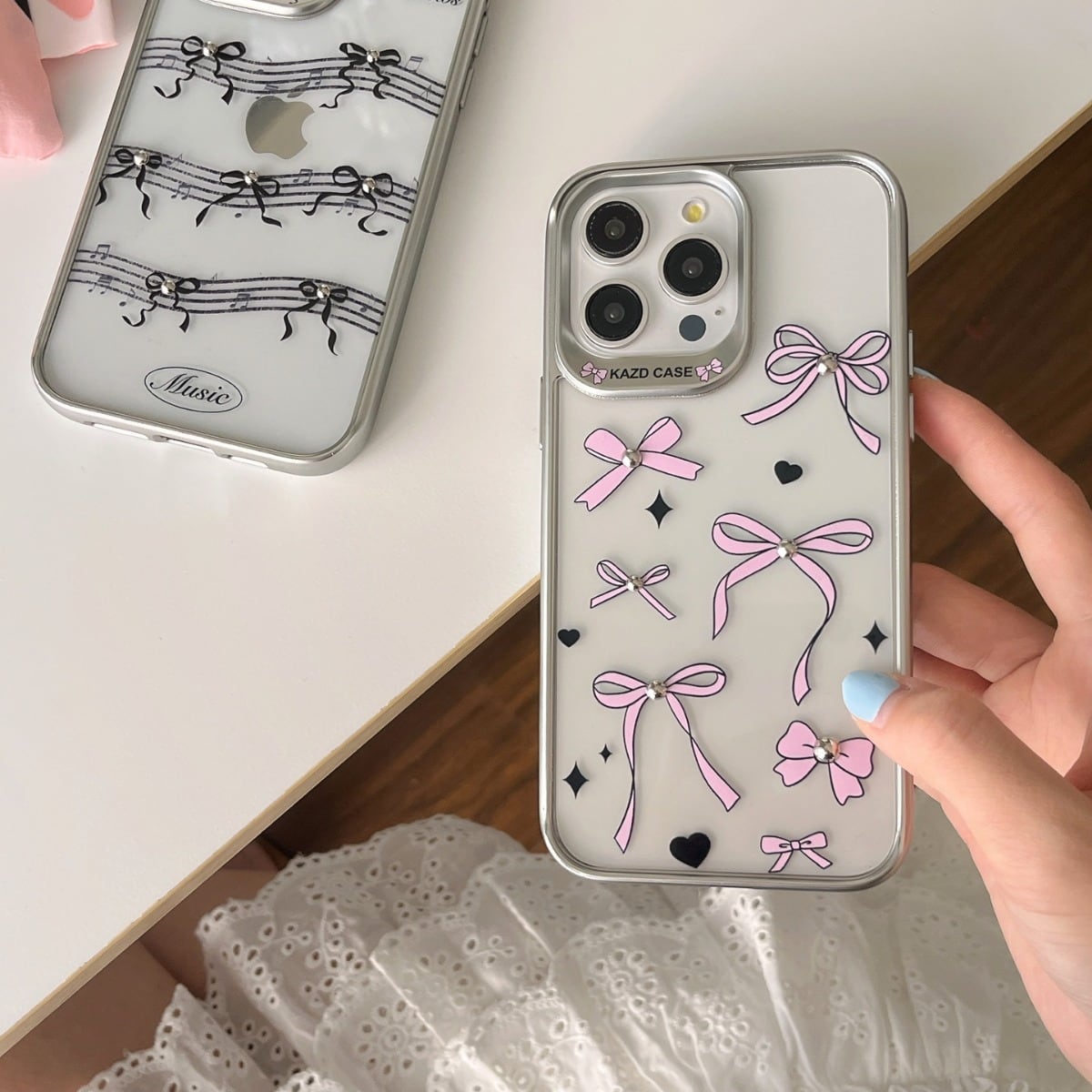 大人可愛いリボン◎マットシルバー クリアケース 保護メタルフレーム 五線譜 かわいい 蝶々結び 透明 スマホケース ND-15929